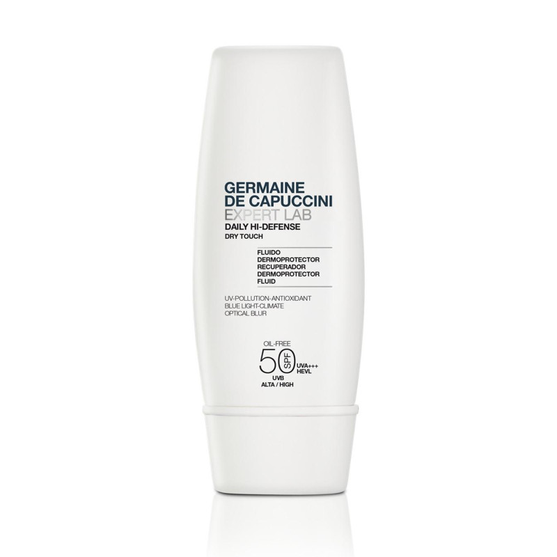 A DAILY HI-DEFENSE DRY TOUCH egy elengedhetetlen, utóápoló termék, amely védi a bőr egészségét és fiatalságát az olyan negatív, külső faktorokkal szemben, mint pl. az UV-sugárzás légszennyezés, kékfény, stb. A színtelen formula nyugtatja és regenerálja a bőrt, elősegítve természetes állapotának visszanyerését. • Kiváló bőrvédelem - védőgátat épít! Az SPF 50 & UVA+++ védőszűrők védik a bőrt a nap, a szmog és a kékfény hatásai ellen. • Azonnali „bonne mine”-hatás - az Optikai Blur-technológia optikailag eltünteti a bőrpírt és a bőrhibákat, melynek következménye a hibátlan és egészséges megjelenésű bőr. • Nyugtató- és regeneráló hatás - csökkenti a bőrpírt, erősíti a bőr természetes barrierjét. • Könnyű és színtelen textúra - gyorsan felszívódik és bársonyos végeredményt hagy maga után.